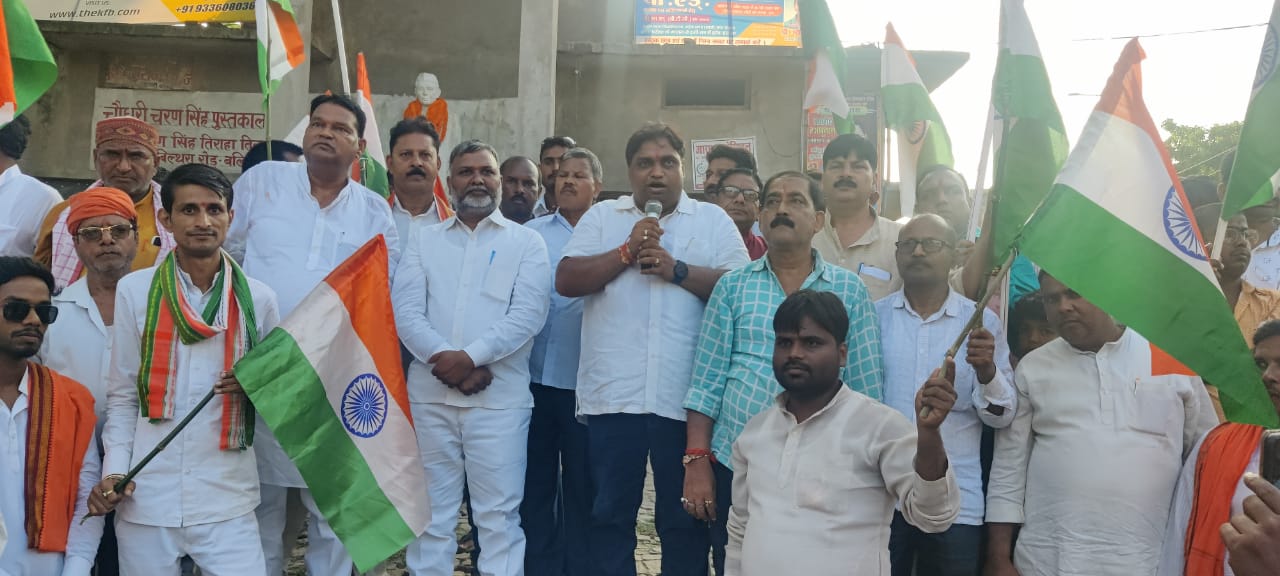बलियाः जनपद बलिया के बेल्थरारोड में शुक्रवार को ऐतिहासिक तिरंगा यात्रा निकाला गया। नगरपंचायत चेयरमैन दिनेश गुप्ता के अगुवाई में विशाल तिरंगा यात्रा में सलेमपुर सांसद रविंद्र कुशवाहा भी शामिल हुए। तिरंगा यात्रा में 151 मीटर लंबा तिरंगा को भी शामिल किया गया। जिसे लेकर युवाओं का जत्था रेलवे चैराहा से पूरे नगर में भ्रमण किया। इस दौरान करीब 2551 हाथों में भी तिरंगा लहराता रहा। तिरंगा यात्रा के दौरान नगर के लगभग सभी घरों के छतो पर भी तिरंगा फहरा दिया गया। जिससे पूरा नगर तिरंगामय हो गया।