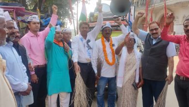 झाड़ू लेकर आप नेताओं ने किया प्रदर्शन