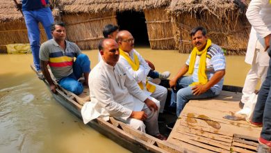 भाजपा के पूर्व सांसद के बाढ़ग्रस्त गांव टंगुनिया नाव से पहुंचे विधायक हंसू राम