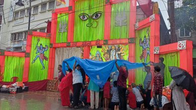 तिरपाल के सहारे पूजा पंडालों में हुआ हवन पूजन