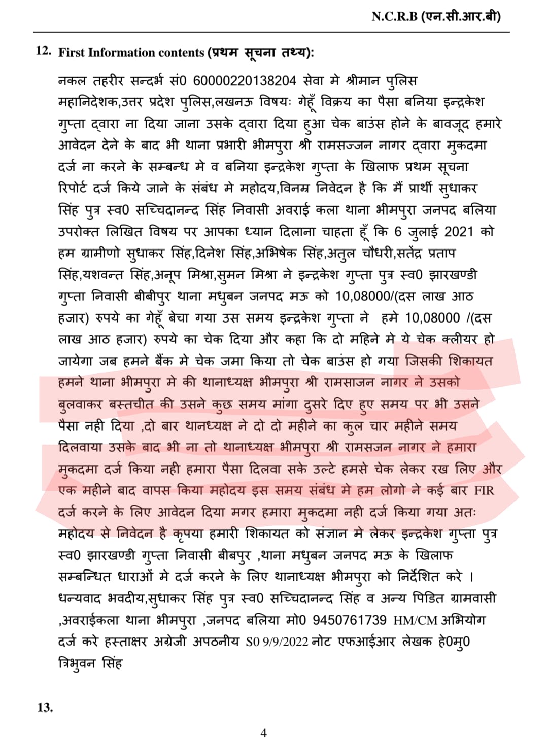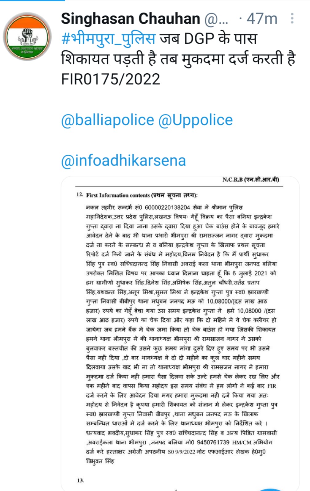 कुछ किसानों के गेहूं के बदले में बिचैलिए ने 10 लाख 8 हजार का चेक दिया और दो माह बाद क्लीयर करा लेने की बात कही। जो जुलाई 2021 में बाउंस हो गया। जिसकी देनदारी को लेकर भीमपुरा थाना में थानाध्यक्ष आरएस नागर के समक्ष कई बार पंचायत हुई और दो दो माह का दो बार समय दिया गया। लेकिन आज तक किसानों के गेहूं के पैसे का भुगतान नहीं किया गया। इसे लेकर वे कई महीनों से थानों का चक्कर लगाते रहे है। पिछले दिनों इसकी शिकायत यूपी पुलिस महानिदेशक से किया गया।